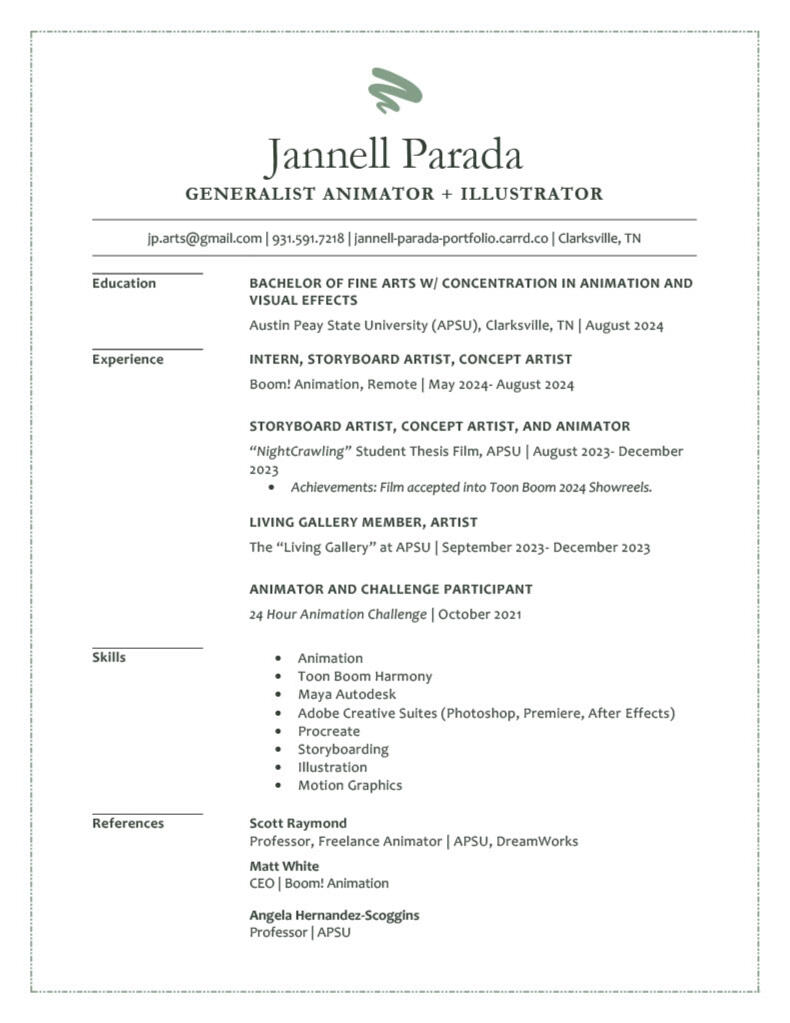 Hello! My name is Jannell, and as of August 2024, I am an Animation and Visual Effects graduate from Austin Peay State University (APSU), where I have spent four and a half years cultivating my passion for the arts. Being a Hispanic artist of Puerto Rican and Colombian descent, my cultural heritage influences my creativity and storytelling, allowing me to bring diverse perspectives to my work in character design and concept art while encouraging me to keep other cultural histories in mind as a fellow minority.As a horror enthusiast, I love to draw inspiration from the macabre, exploring the depths of the human psyche to create captivating characters and scenes. During my time at APSU, I worked on several notable projects, including "NightCrawling," a short animated film that received recognition by being included in Toon Boom's 2024 Educational Reel, and a soon-to-be animated series called "Ghoul Sitters," where I collaborated with Boom! Animation during a remote summer internship. In this project, I developed a storyboard with the co-CEO that featured original character designs and animations.I like to define myself as an animation generalist, with experience beginning from 2D and 3D animation to illustration and visual effects. I favor 2D projects for their unique visual charm and how they can stylishly convey emotion and character in a hand-drawn format. A favorite but personal example are works like "Tom and Jerry" and movies like "The Prince of Egypt." Despite this preference, I enjoy switching and learning between the two art worlds as both forms of animation are influential for the audiences they reach. My interest in creature and character design has expanded to include 2D and 3D rigging, animation, and visual/narrative development for films, shows, and games.My future goals are to refine my artistic skills through hands-on experience and contribute to the next iconic monster for a future horror movie or game series. Outside of the industry, I aspire to deepen my relationship with art and forge a promising future despite any pessimistic thoughts that say otherwise.